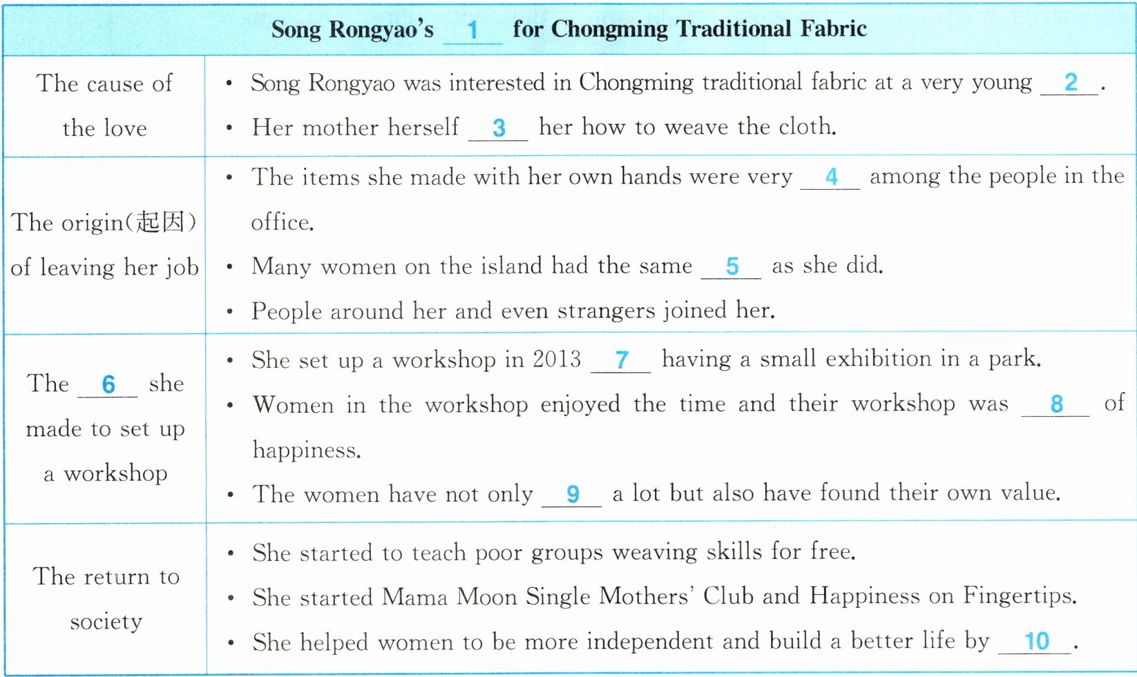 Song Rongyao, from Shanghai's Chongming Island, used to have a steady(稳定的) job. Four years ago, she finally decided to give up her job. She did it not because she hated her job, but because her job was getting in the way of her true love. She has been interested in Chongming traditional fabric(织物), made from cotton and coloured with plant dyes(染料) since she was a girl. She learnt how to weave(织) the cloth from her mother.
