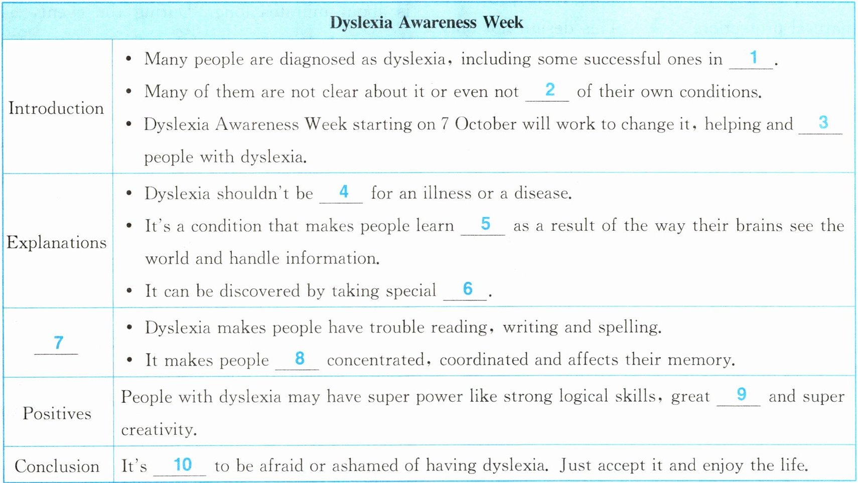 People diagnosed (诊断) with dyslexia might worry how others see them,but thinking differently can be a super power. Many people with dyslexia often have strong logical skills and great imaginative ideas. They can be good at spotting patterns and solving problems. They can be super creative too—there are many authors,actors and inventors from every corner of the world who thrive with the condition. Dyslexia is nothing to be afraid or ashamed of. It's part of you.