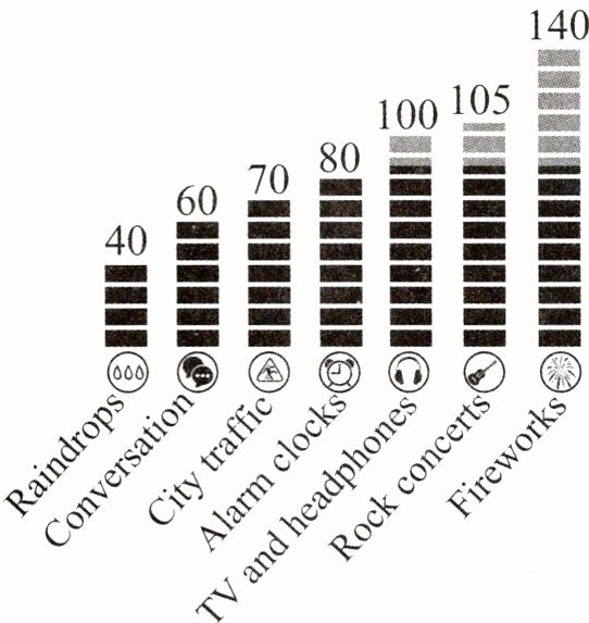 Sounds are measured(测量) in decibels(分贝). Look at the chart—some sounds are safe for our ears, but when a sound goes over 85 decibels, it can be harmful to our hearing. To reduce the risk of hearing loss, we shall pay attention to the loudness of the noise, the distance we are to it and how long we listen to it.