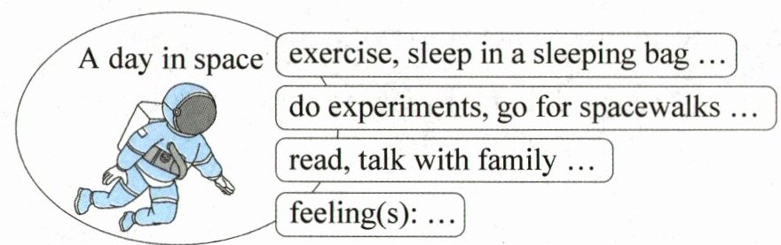早上,我会用特殊的器械锻炼来保持健康。在太空中进食很有趣!我们的食物装在特殊的袋子里,我们需要紧紧握住袋子,以免它飘走。在这里睡觉也很有趣。我睡在一个固定在墙上的睡袋里。工作时间里,我会做实验,有时还会进行太空行走。那感觉就像在飞翔!工作结束后,我会读书或者通过视频通话和家人聊天。每当我想念地球的时候,我就会望向窗外,外面的星空景色令人惊叹。