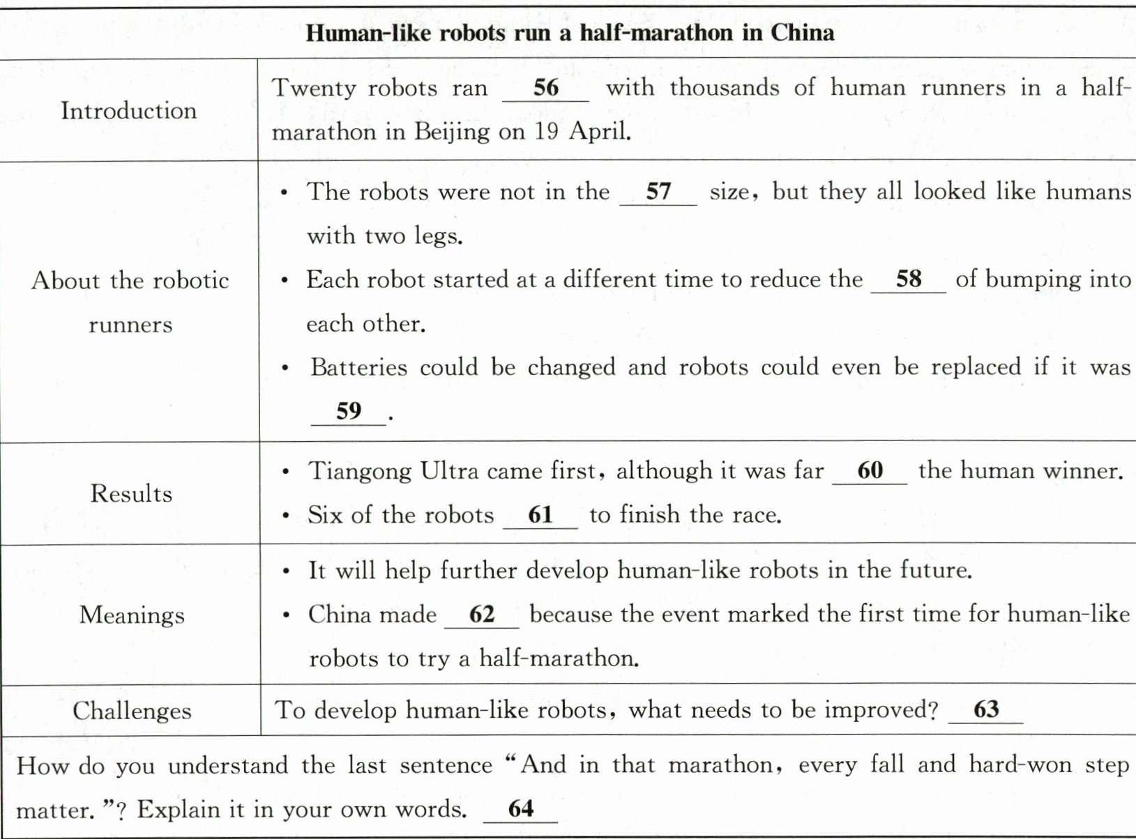 In the future, as AI gets smarter, the gap(差距)between humans and machines will narrow. For China, developing these human-like robots isn’t just about making them run faster—it’s about which country can make full use of science and technology to take the lead in the world.