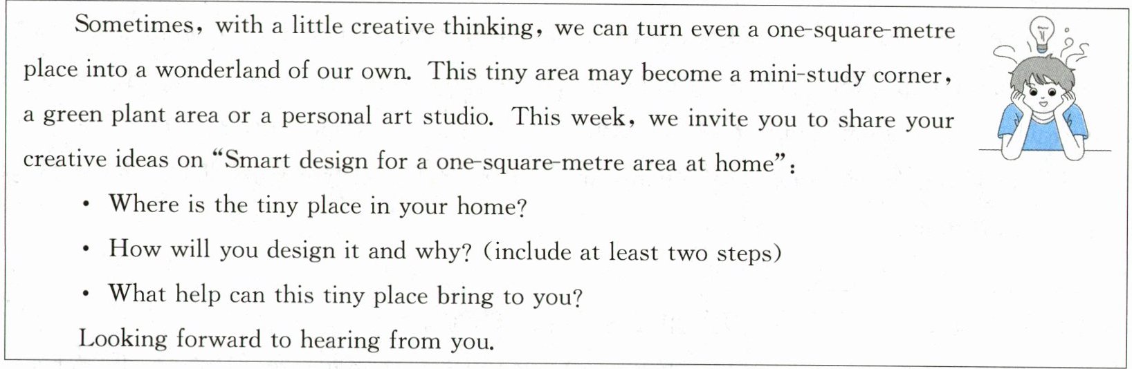 With a little creative thinking, even a one-square-metre area at home can be turned into a wonderland of our own. In my bedroom, beside my bed is a small corner of about one square metre, which is a perfect choice for a new design. I decide to turn it into my personal reading corner. First, I will put a shelf at the corner. Then, I will choose some of my favourite books to put on the shelf so that I can read them whenever I want. Of course, a vase of beautiful flowers is a must at my reading corner since they can always make me feel the beauty and romance of the world. Last, I will lay my favourite musical instrument—a guitar there. If I am tired after reading, I can play the guitar to get relaxed. This tiny place is a wonderland for a book-lover like me. It is a place where I can lose myself in the world of books and spend time with myself, away from the hustle and bustle of daily life. I'm sure it will make my home cozier and warmer.