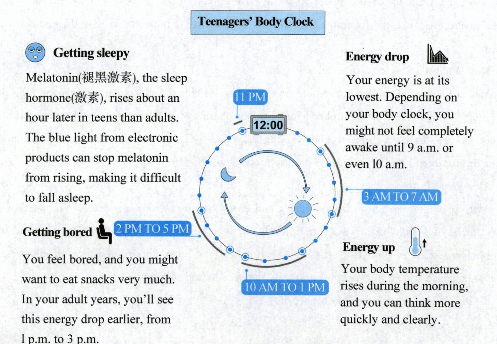 26. D 【解析】根据“Getting sleepy”下的“The blue light from electronic products can stop melatonin from rising, making it difficult to fall asleep.”可知,电子产品发出的蓝光会阻止褪黑素的分泌,使人难以入眠。因此D项与之相符。