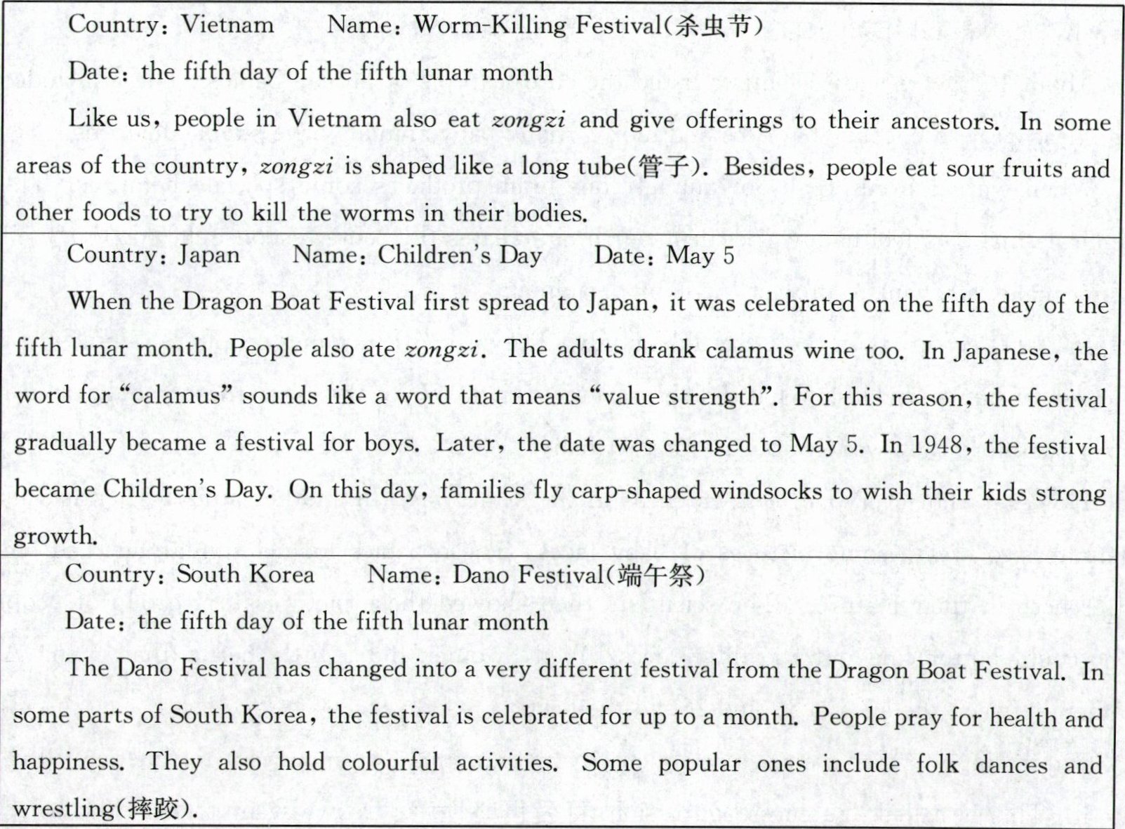 文化意识 The Dragon Boat Festival has spread to many countries, including Vietnam, Japan and South Korea. It has developed in different ways in these three countries.