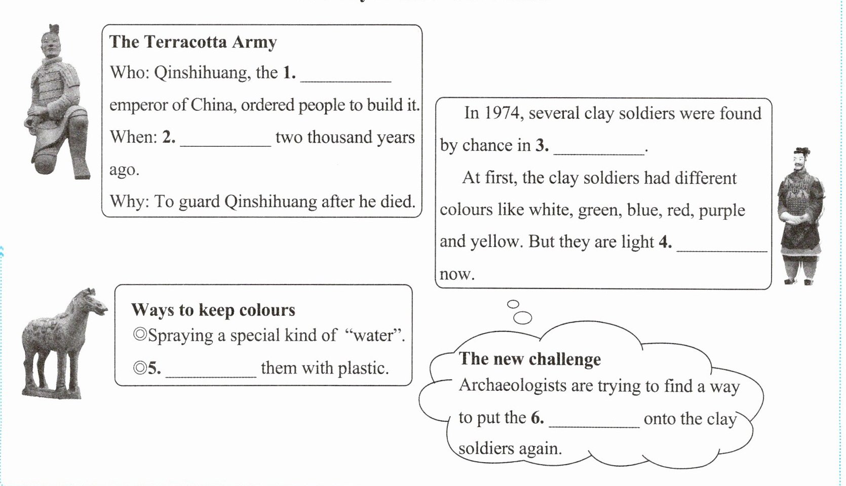 An area with more than one hundred clay soldiers was discovered by some archaeologists a few years ago. Many of them still had black hair, pink faces and black or brown eyes when they were discovered. After a clay soldier was found, archaeologists used two steps to keep its colour. First, they sprayed a special kind of “water” on it. Then, they covered it with plastic.