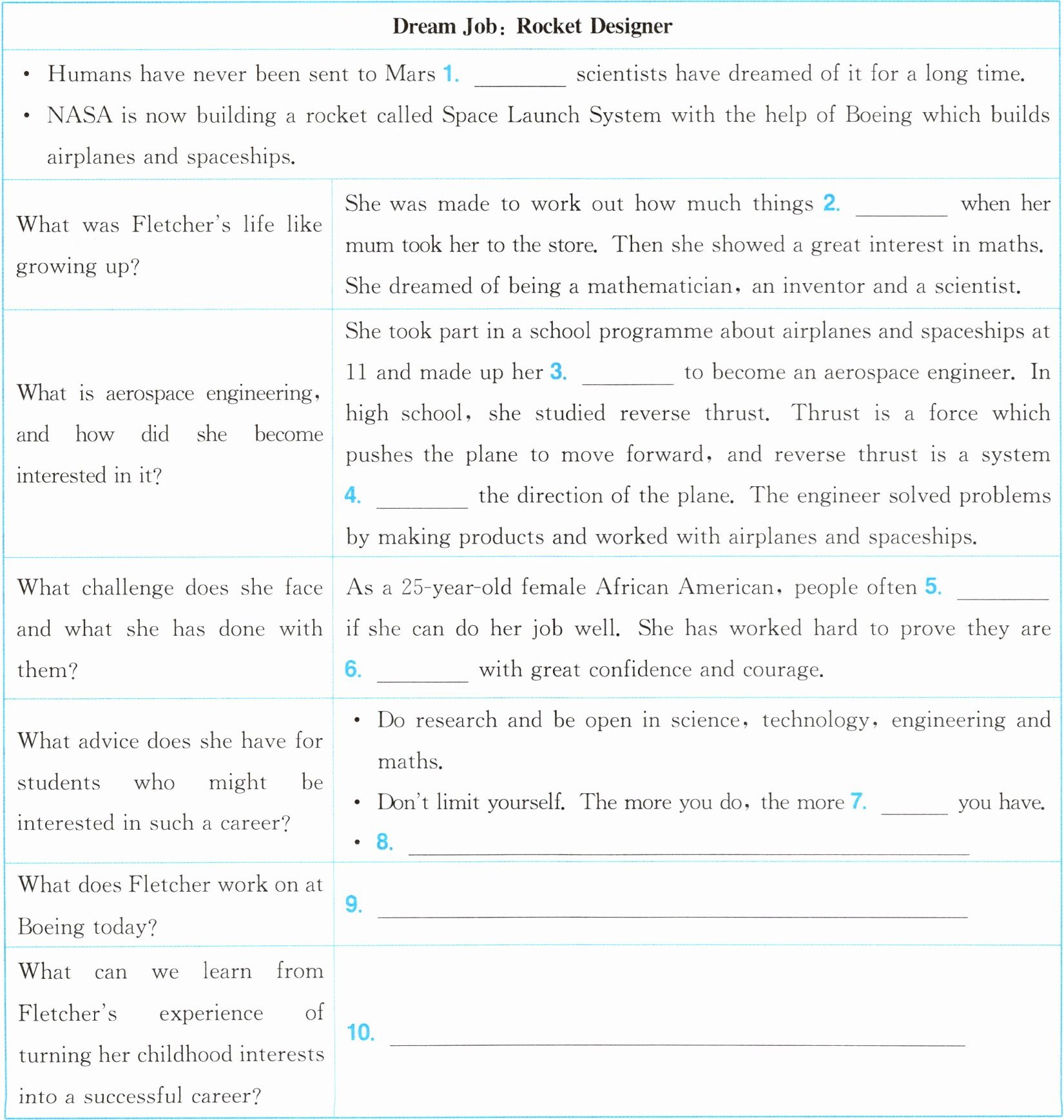 根据短文内容完成下面的表格,第1—7空每空一词,第8—10空每空词数不限。