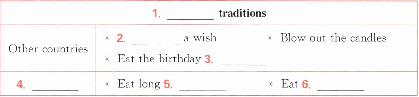 1. 表格填空:先通读短文,明确全文围绕不同国家的生日传统展开,因此表格标题的空缺处可确定为和生日相关的词汇;接着针对“Other countries”板块,从原文中定位到对应的生日习俗表述,提取关键动词和名词填空;最后看下方板块,原文单独介绍了中国的生日饮食传统,据此定位中国的特色生日食物完成填空。