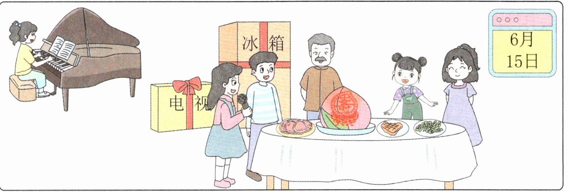 提示:今天楠楠与堂兄妹一起为祖父贺寿。堂哥 Jack 在父母的帮助下为祖父买了新的电视与冰箱。楠楠则以传统寿桃献礼。寿宴上,堂妹 Lucy 演唱了《茉莉花》,堂姐 Ruby 弹钢琴伴奏。堂姐 Cathy 为祖父做了美味又健康的菜肴。大家都很开心。