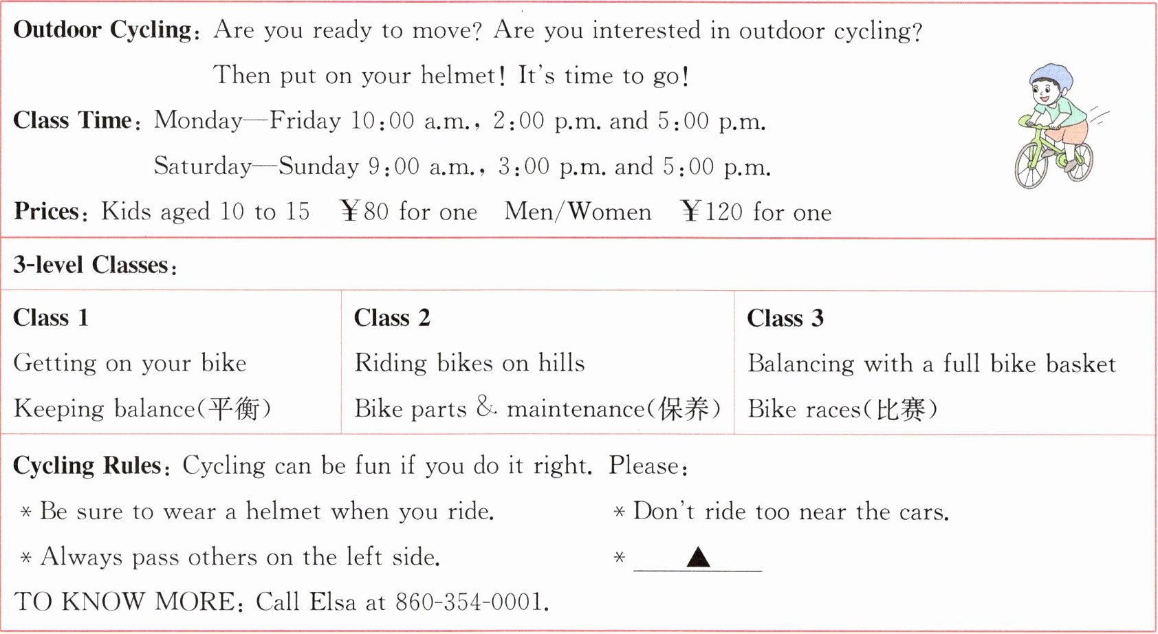二、图图也很喜欢自行车,但是他还不会骑,于是亮亮将刚搜到的户外骑行课的宣传单发给了图图。阅读宣传单,选择正确的答案。