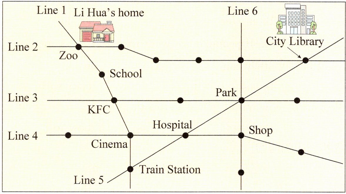 2. 第2题:找到李华家的位置,查看周边地铁线路,判断哪条线路能直达市图书馆,确定最佳选择。