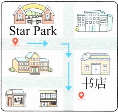 4. 观察路线图,从Star Park出发的行进方向是右转,之后能看到左侧的书店,结合首字母可填写对应短语和单词。