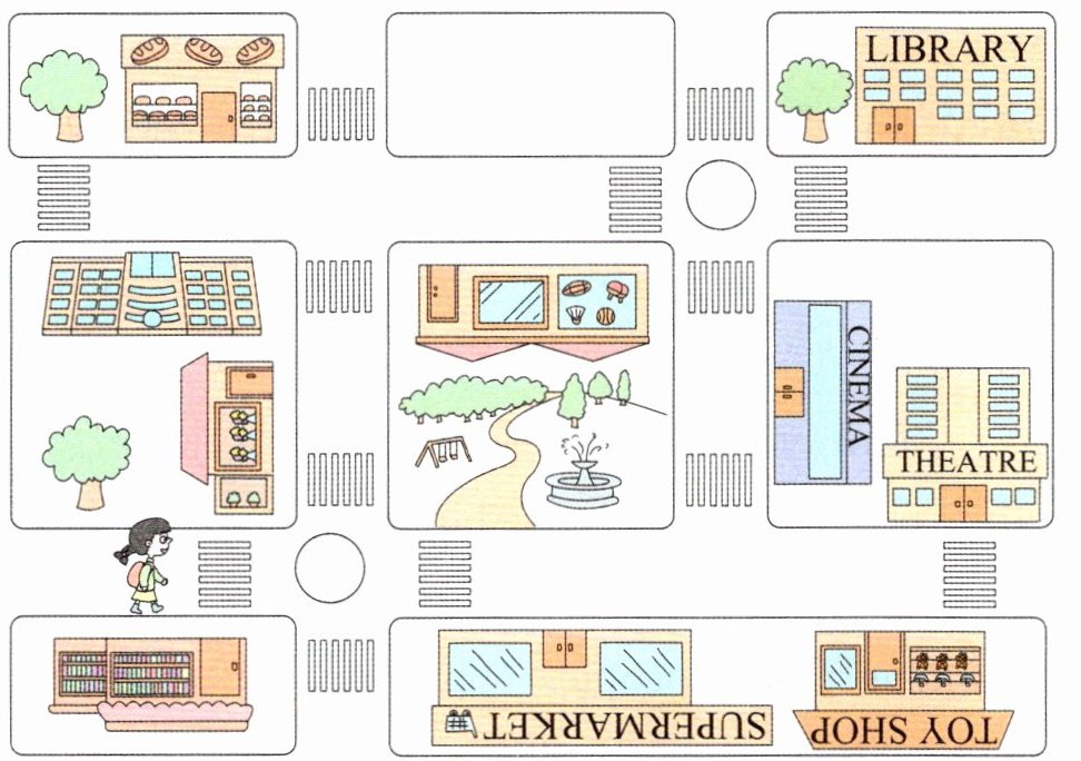 答案:1. the toy shop 2. the cinema 3. the supermarket 4. the library