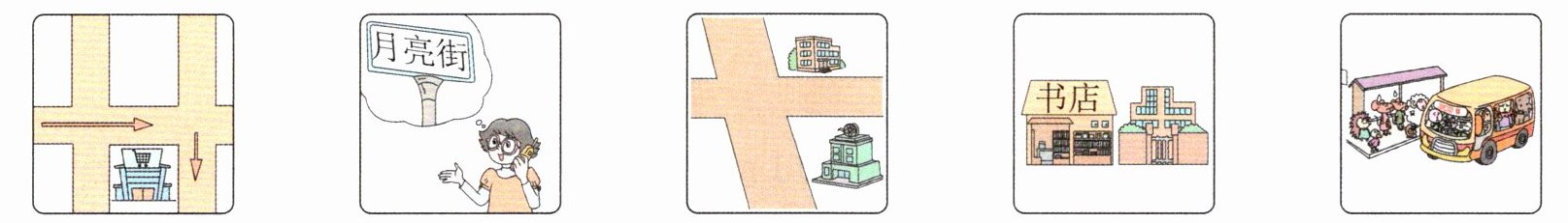 1. 先观察所有图片,明确每幅图的核心内容:图1是带箭头和建筑的十字路口,图2是“月亮街”路牌和打电话的人物,图3是书店及相邻建筑,图4是十字路口的两处建筑,图5是公交车站乘车场景。