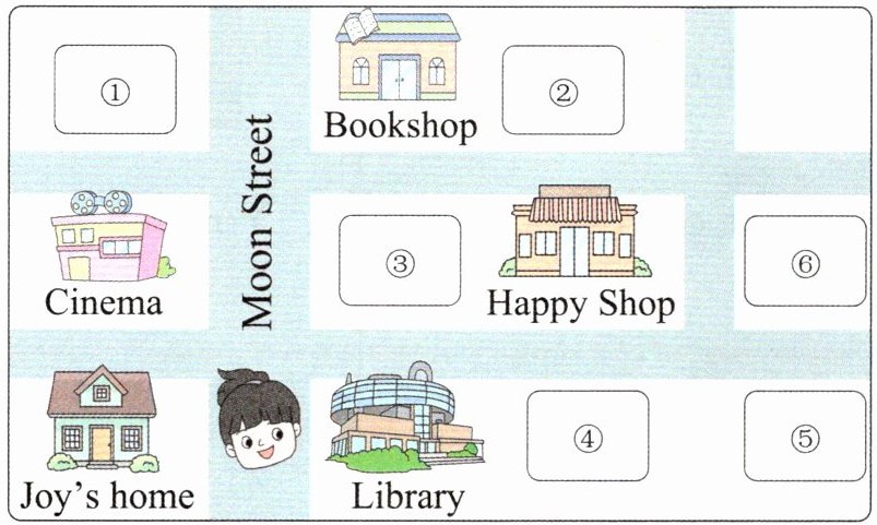 1. 先观察题干中的地图,熟悉已给出的场所(Bookshop、Cinema、Happy Shop、Library、Joy's home、Museum)的位置,明确Moon Street的走向,理清各个空白位置的方位关系。