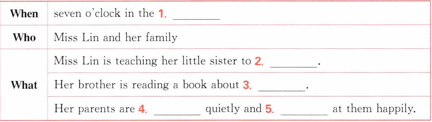 1. 预读表格:先快速浏览表格的When、Who、What三个板块,明确每个空缺需要填写的信息类型,比如第1空是和seven o'clock搭配的时间时段,第2-5空是人物对应的动作或相关内容,提前预判听力重点。