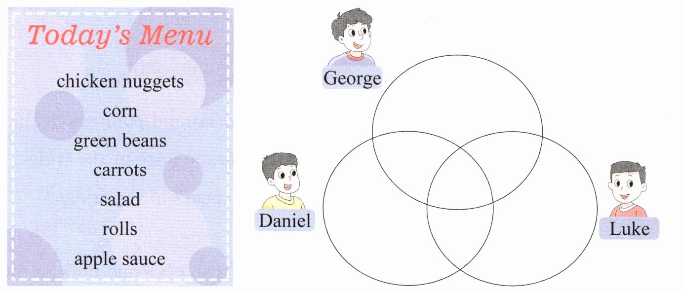 Daniel get hungry. They all get a lunch tray(托盘),go through the lunch line and sit together to eat. These students all have the same lunch menu, but each of them only eats what he or she likes. George eats chicken nuggets, green beans, apple sauce and carrots. Daniel eats chicken nuggets, green beans, rolls and corn. Luke eats chicken nuggets, rolls, apple sauce and salad.