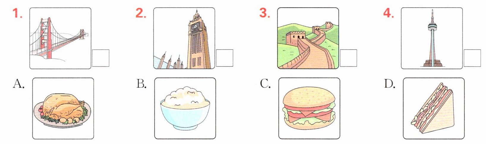 这是一道听力匹配类题目,解题核心是先识别地标对应的国家,再结合听力对话中的信息,将国家与对应的特色食物建立关联。具体思考步骤:①先辨认上方的地标建筑,明确其所属国家;②再结合听力内容,匹配该国的代表性食物,完成对应选择。