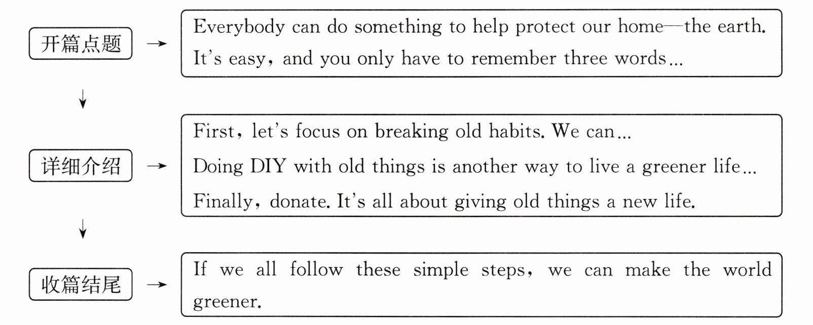 遣词造句1. We can avoid wasting food by eating our leftovers.2. Old toys, books or clothes can be donated to people in need.3. If we all follow these simple steps, we can make the world greener.
