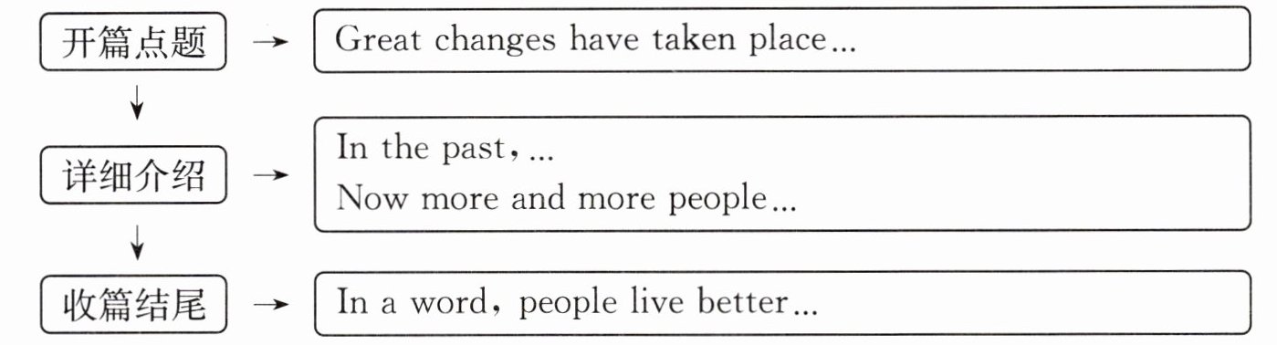 答案:Great changes have taken place in people's lives over the years.In the past, a big family had to live in a small house. People kept in touch with relatives and friends by writing letters. They watched TV, listened to the radio or read newspapers for news and other information. Children used to go to school on foot or by bike.Now more and more people live in big and bright flats. People can talk to others over the telephone or on the Internet. Almost every family has computers. They often use computers to do many things. Sometimes, they go travelling in their free time. For example, they go to some theme parks. Today, people still ride their bikes to school or work, but they can also travel by bus, by taxi or by underground. More and more families have their own cars.In a word, people live better than before. I'm so excited to see these changes.