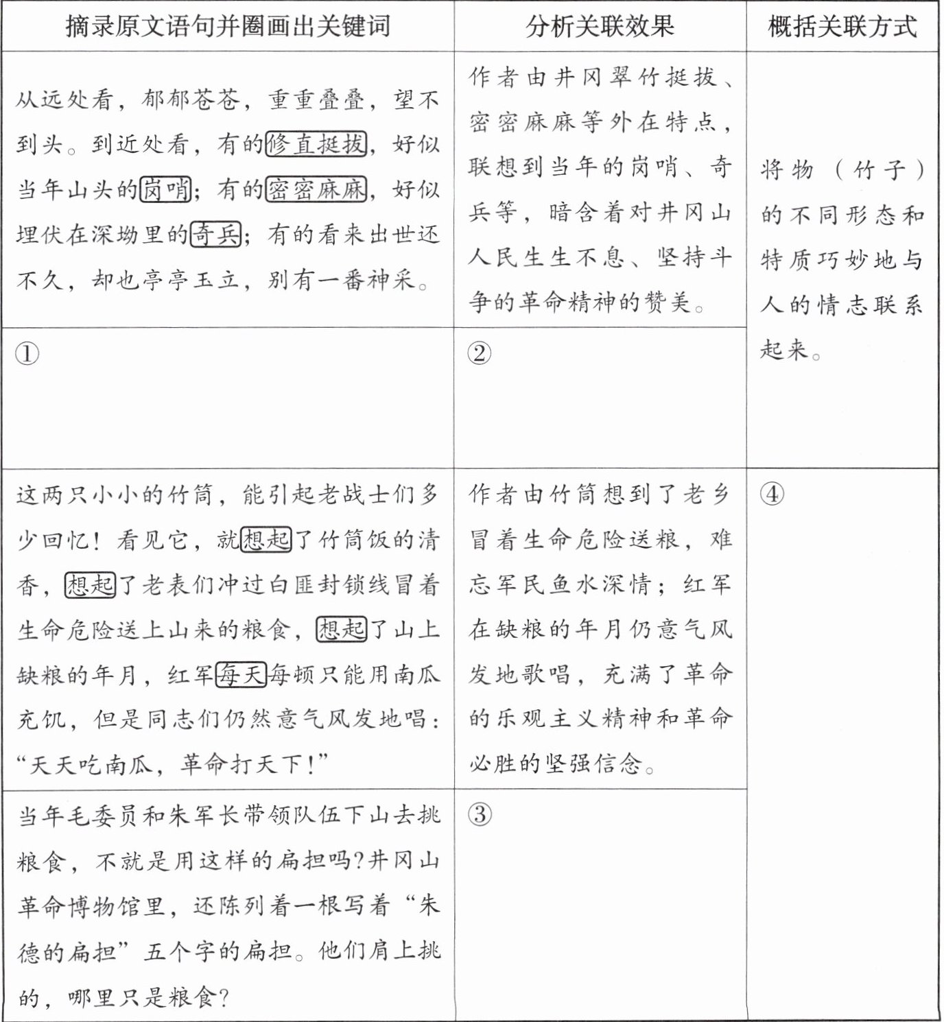 答案:(1)①[示例]血雨腥风里,毛竹青了又黄……还有深埋在地下的竹根。圈画“又”“还有”等字词 ②[示例]作者由井冈翠竹生生不息的生命力,联想到井冈山人民在革命斗争中前赴后继、坚贞不屈的革命斗争精神。 ③[示例](圈画“不就是”“哪里只是”等字词) 作者由毛竹做的扁担的坚韧和结实,联想到毛委员和朱军长带领队伍下山去挑粮食的故事,书写了革命者的责任和担当,作者的赞美之情不言而喻。 ④[示例]将竹子的用途巧妙地与人的情志联系起来。 (2)[示例]井冈翠竹不仅象征革命者、建设者,还象征着军民一心、坚贞不屈、积极乐观、勇于奉献等井冈山精神。