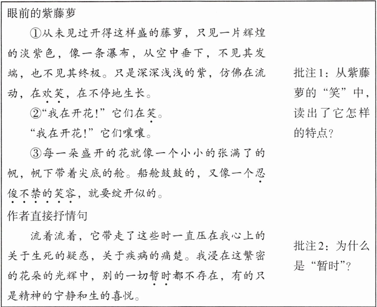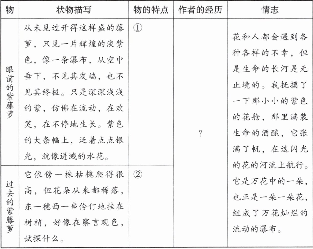 答案:[示例](1)作者将眼前的紫藤萝旺盛的生命力刻画得淋漓尽致,如反复以“笑”将花朵拟人化,赋予紫藤萝花人的性格情趣,表现花儿争相开放的天真欢乐,充满生机与动态美。而紫藤萝这种带着“欢乐”的生命力,感染着被“生死的疑惑”“疾病的痛楚”所困的作者,让作者沉浸其中,感受到“精神的宁静”和“生的喜悦”,使物与情有了联结。 (2)[示例]①蓬勃、热烈、茂盛 ②稀落、伶仃 我的推测与理由:作者在生活中可能经历了生离死别的不幸之事。因为作者笔下“过去的紫藤萝”是如此的衰败;“现在的紫藤萝”却再次旺盛与繁茂,让作者深受触动,感受生命就如“万花灿烂的流动的瀑布”。“一切景语皆情语”,基于景的特征及其引发的作者的情感变化,我作了这样的推测。