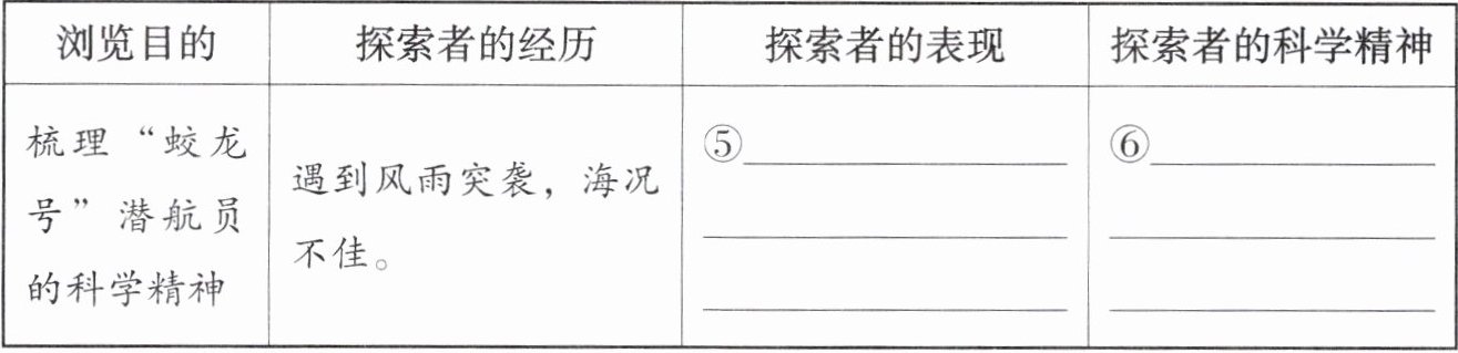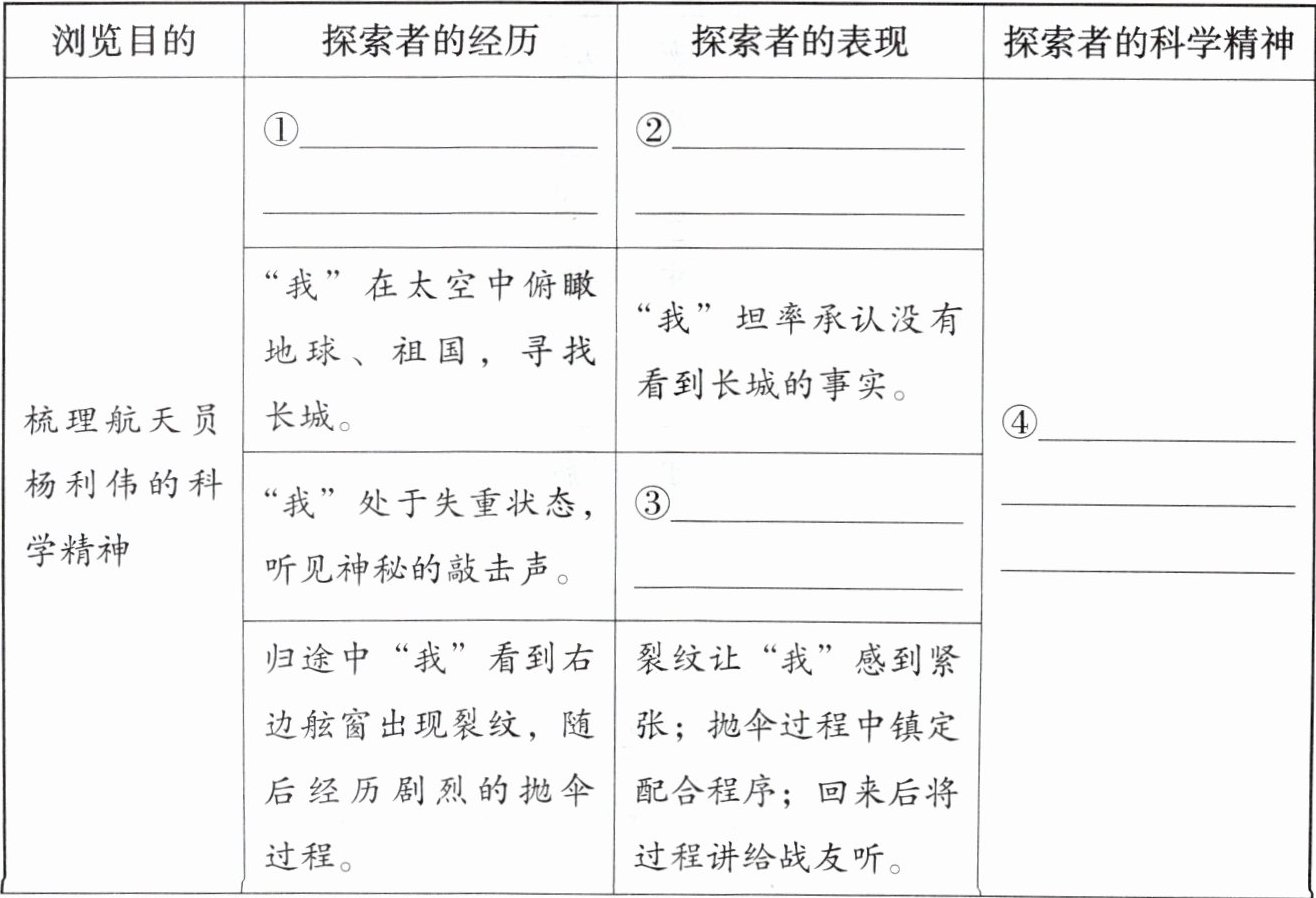1. 运用“小贴士”中的方法,快速浏览《太空一日》和《“蛟龙”探海》,补全记录表,提炼并概括探索者的科学精神。