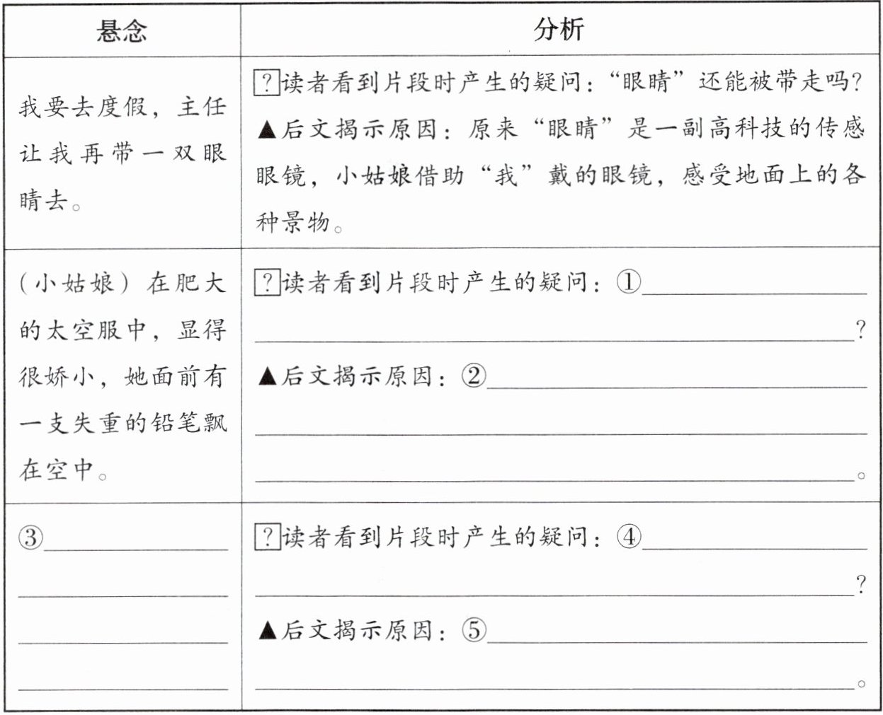 (1)梳理分析文中设置的悬念,将表格补充完整。