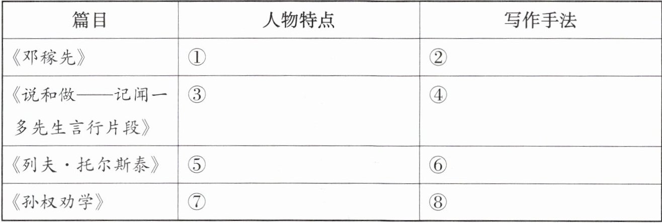 答案:1. [示例]①热爱祖国、忠厚平实、从不骄人、身先士卒等 ②记述典型事件,运用对比手法等 ③治学严谨、英勇无畏、热爱祖国、言行一致等 ④记述典型事件,运用细节描写等 ⑤睿智深邃、心系人民等 ⑥先抑后扬,运用细节描写等 ⑦(吕蒙)知错就改,善于听取他人建议,学习勤奋刻苦 ⑧运用侧面衬托的手法等