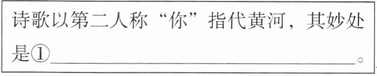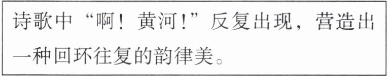 答案:导学二 ①无形中将诗人与黄河的距离拉近,创建了一种亲昵对话的情境,增强了诗歌的亲切感,也更能引发读者的情感共鸣 ②[示例1]屏障 黄河对中华民族的保卫之义 [示例2]臂膀 黄河对中华民族的滋养之情 ③结尾处的反复是连续出现的,强化了对黄河精神的赞叹,强调了歌颂黄河、学习黄河的主旨,具有振奋人心,令人印象深刻的艺术效果。 ④从对黄河的敬仰到对中华民族的赞颂,最终发出向黄河学习的呼告 ⑤使情感表达更加强烈,更有感染力,达到震撼人心的效果