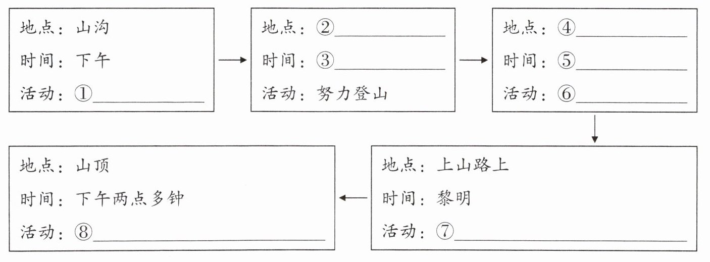 答案:①拜访瑶民 ②山脚 ③天黑了 ④半山腰 ⑤半夜里 ⑥露宿冻醒 ⑦吃饭登山 ⑧休息下山