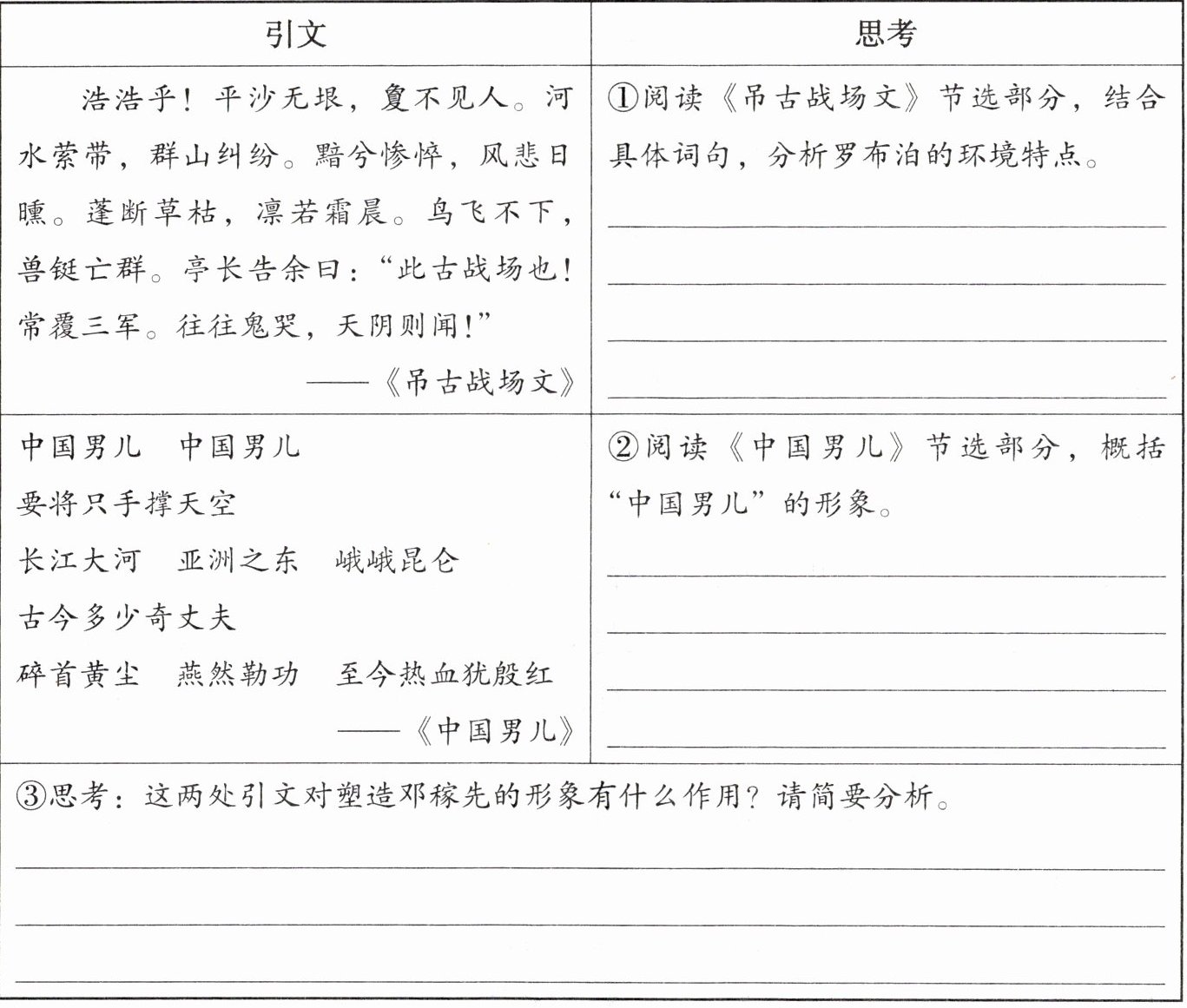 答案:导学二 ①引文选用“断蓬”“枯草”这类意象,运用“无垠”“夐”“黯”“惨悴”“悲”“凛”等形容词,以及引用亭长的话,描绘出罗布泊萧索荒凉、广阔无垠的环境特点。 ②信念坚定、甘为祖国献身的奇丈夫形象。 ③第一处引文展现了自然环境的恶劣,可见邓稼先工作条件的艰苦,烘托出邓稼先为祖国不辞辛劳、艰苦奋斗、无私奉献的精神品质。第二处引文引用《中国男儿》的歌词,借以赞颂邓稼先为祖国不畏艰难、无私奉献的精神和顶天立地、贡献巨大的“中国男儿”形象。