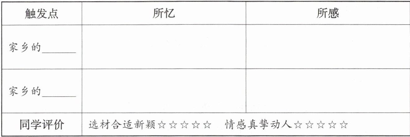 2. 通过以上交流,你是否回忆起了许多与家乡有关的人、事、景、物?它们是乡情的触发点。请从家乡的人、事、景、物中选择两项,将你的所忆、所感记录在表格中,使其成为你的写作素材,并让小组同学从“选材”和“情感”两个角度对你的素材进行评价。