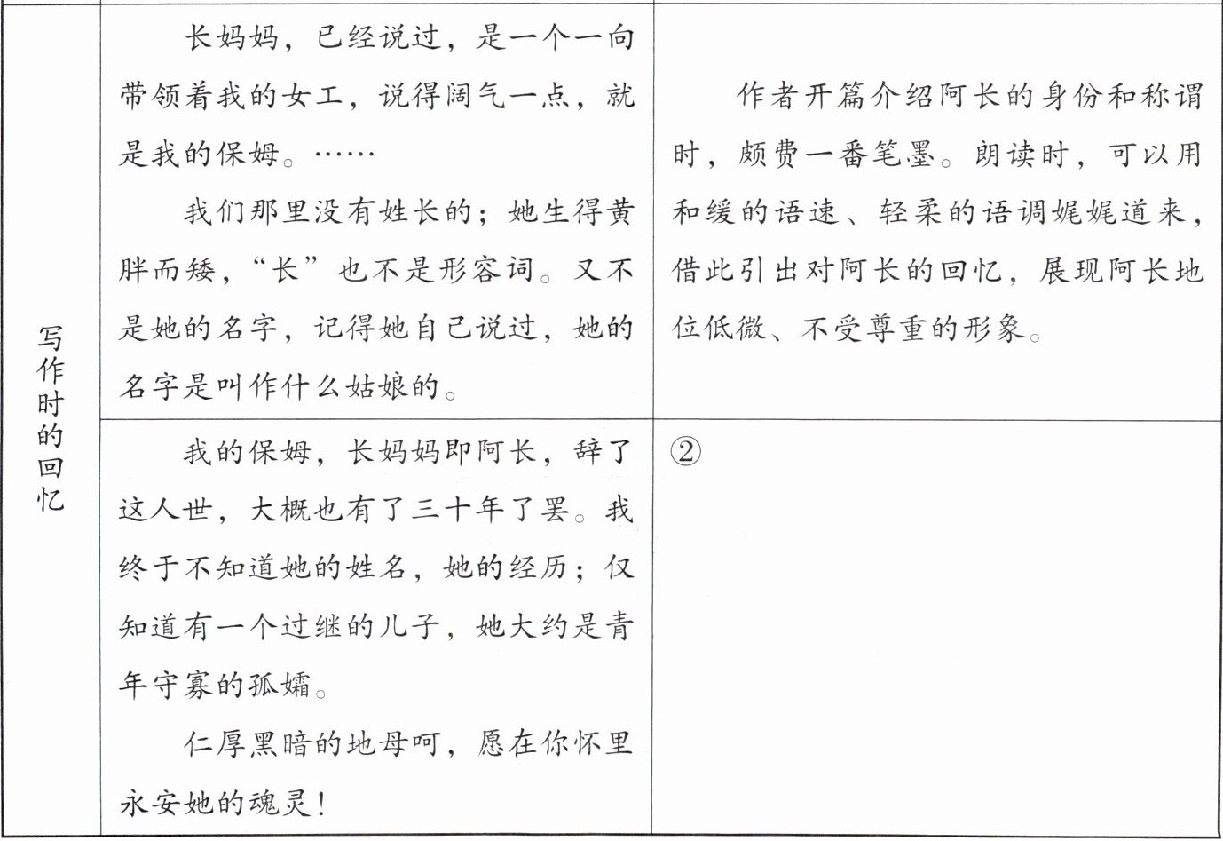 答案:导学二 ①[示例]阿长给“我”买到了童年时“最为心爱的宝书”,由此“我”彻底改变了对阿长的态度。朗读时,重读“又”“却”“确有”“完全”等词,强调阿长的“神力”和“我”态度的转变。可以带着激动的情绪,读出“穿着新的蓝布衫”的阿长的光彩照人和鲜活可爱。 ②[示例]作者的思绪从三十年前切回现实,对阿长的回忆包含了感激与同情。朗读时,重点强调“我终于不知道她的姓名”一句,用低沉的语调读出作者的思念和歉疚。读最后一段时,语调逐渐上扬,声音逐渐加强,用深情的祝祷将全文情感推向高潮。