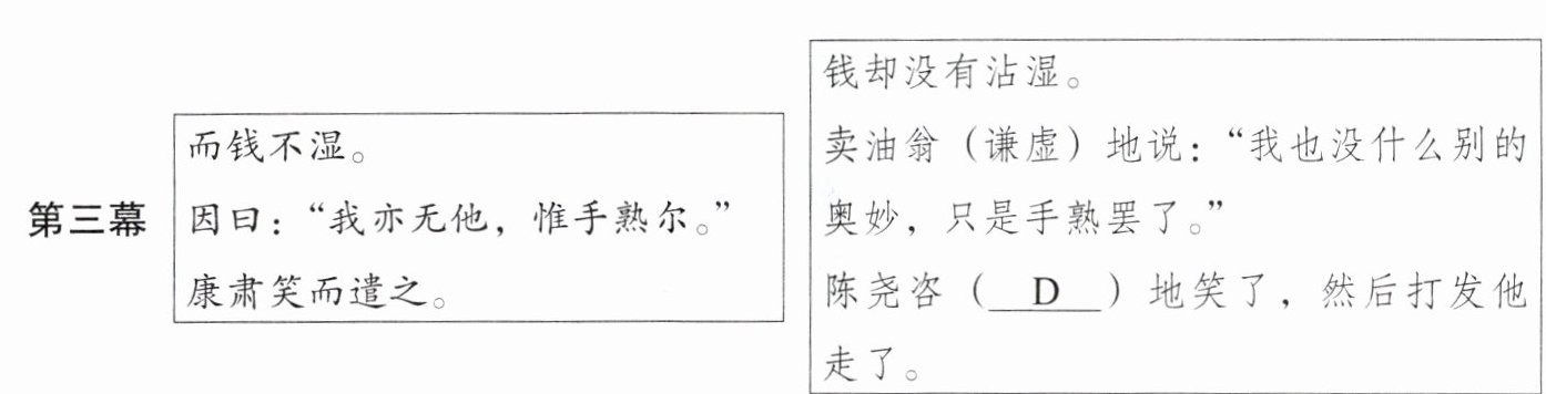 (3)在给第三幕D处“笑”加个形容词的学习任务中,大家产生了分歧,你的选择是