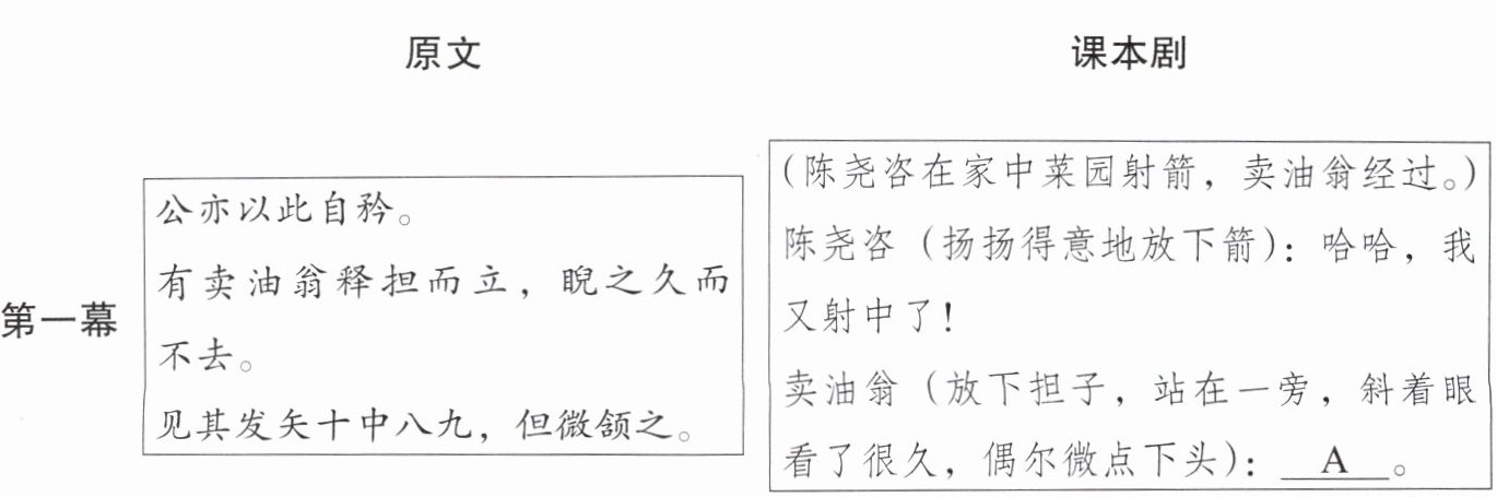 在综合实践课上,老师决定把《卖油翁》改编成课本剧,小文已经修改了一部分。请你仔细阅读课文,一起来完成下面的任务。