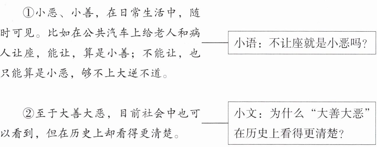 答案:3*. (1) [示例]摘录:我觉得,只要诉诸一般人都能够有的良知良能,就能分辨清是非善恶了,就能知道什么事应该做,什么事不应该做了。 思考:分辨清是非善恶,知道应不应该,就能做到有为有不为了吗? (2) [示例]选择小文的思考。由于历史的沉淀和时间的考验,历史上的大善大恶行为往往显得更为清晰和突出。历史的记录为我们提供了更为客观、全面的视角,使我们能够更深入地理解这些行为的背景、原因和影响。同时,由于历史的距离感,我们也能更冷静地反思和评价这些行为,从而从中汲取教训,为当前和未来的社会发展提供借鉴。 (3) [示例]作者经历过大苦大悲,他深刻领悟了生命的智慧之核——有为有不为。这些观点,并非轻而易举可得,而是个体生命在岁月的磨砺中,通过对做人良知与原则的坚守,逐渐修炼而成的一种境界。“有为有不为”,这不仅仅是一种生活哲学,更是对自我良知与原则的坚守。有所为,是为了心中的道义与责任;有所不为,则是对自己良知的尊重与守护。作者想告诉人们的,不仅仅是如何求得心安,更是如何通过为善、不为恶,用更高的道德标准进行自我引导和约束,让我们的生命之舟在波澜壮阔的人生长河中找到属于自己的港湾,实现生命的价值。