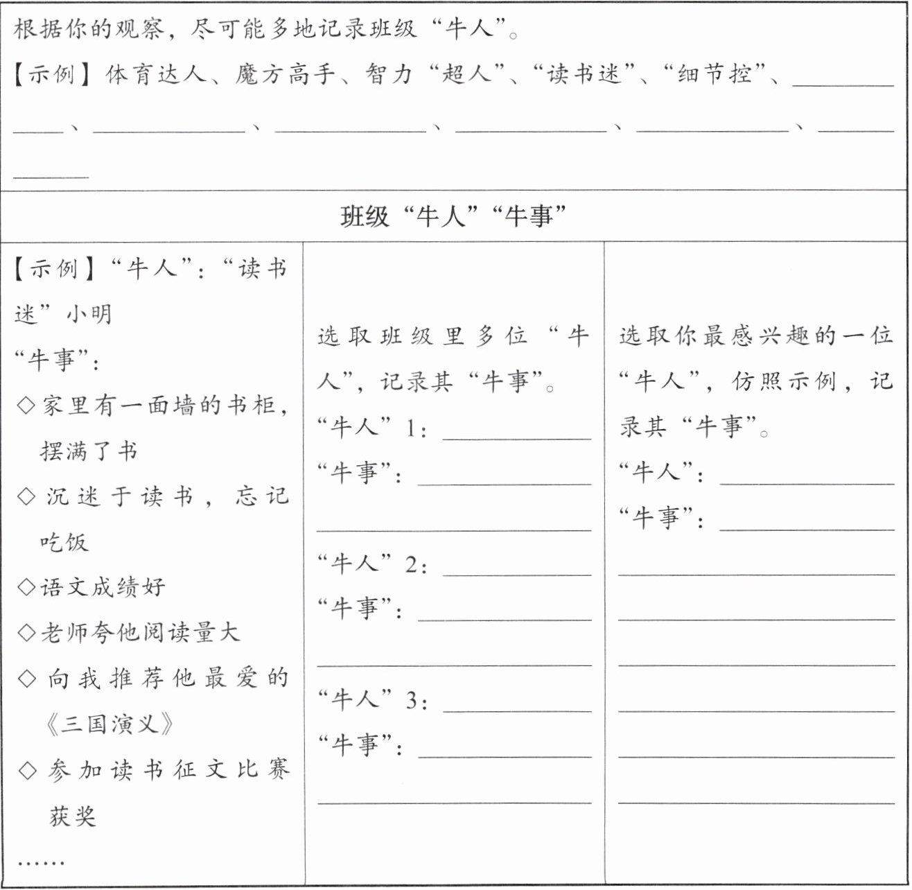 3. 根据选材启示,结合《班级“牛人”“牛事”记录表》,完成写作拼图。
