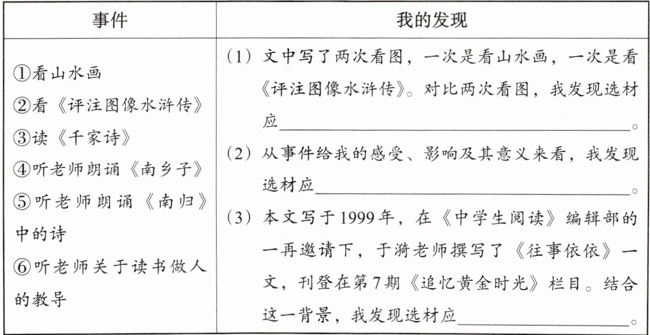 5. 发现选材要点:梳理《往事依依》中的事件,根据提示补全选材特点。