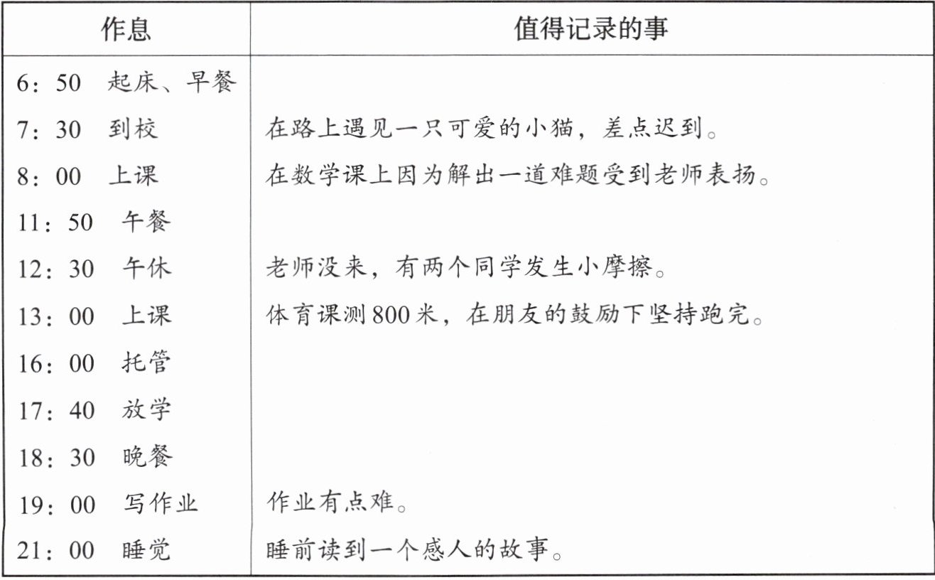 4. 搜集写作材料:参照示例,完成《“我的一天”观察记录表》。