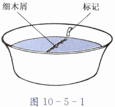 把装有水的洗脸盆放在平稳处,另取一块比洗脸盆大一些的硬纸板,并在上面剪一条狭缝,缝的长度比盆的直径短3~4 cm,然后把硬纸板盖在盆上,把细木屑撒在硬纸板上,使一些木屑从狭缝落到水面上,拿开硬纸板,水面上留下一条细木屑带(图10-5-1)。为了记下它的方位,在盆口轻轻做个记号。几小时后,你会发现木屑带明显转过了一个角度。其实盆内的水和木屑并没有转动,只是地球自转时带动盆一起旋转,而盆内的水因和盆壁间摩擦很小而没有跟随盆一起转动,于是出现了上述现象。这个简单的实验可以证实地球在自转。