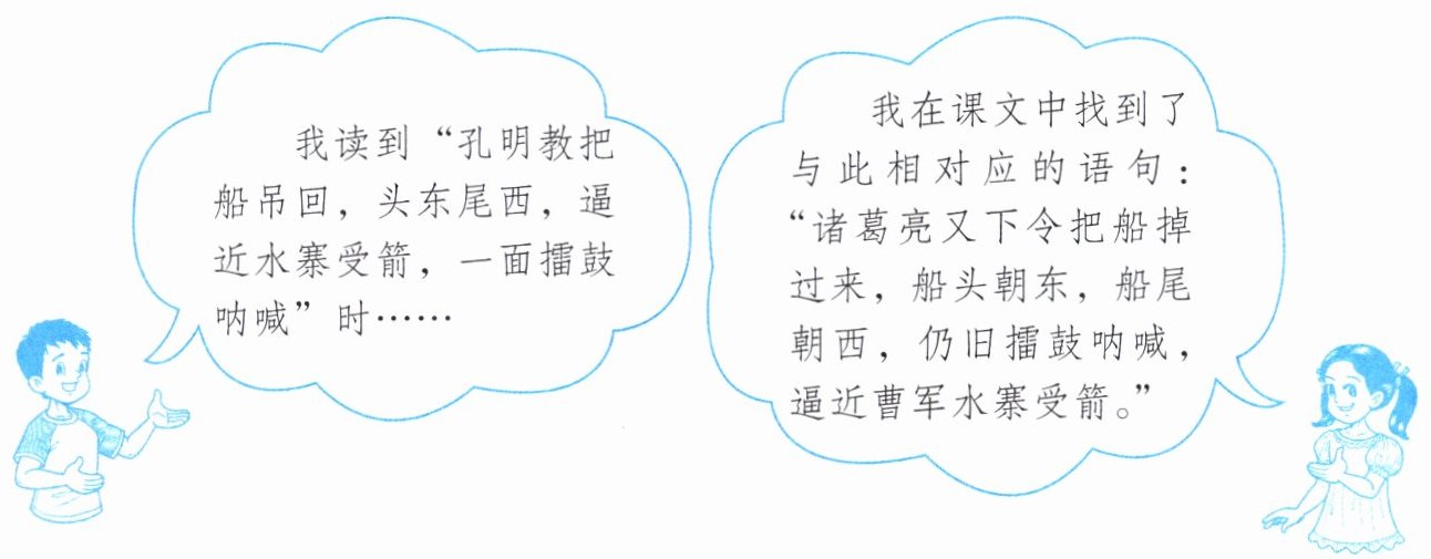 答案:阅读原著中“孔明教把船吊回,头东尾西,逼近水寨受箭,一面擂鼓呐喊”和课文中“诸葛亮又下令把船掉过来,船头朝东,船尾朝西,仍旧擂鼓呐喊,逼近曹军水寨受箭”这两段话相对应。
