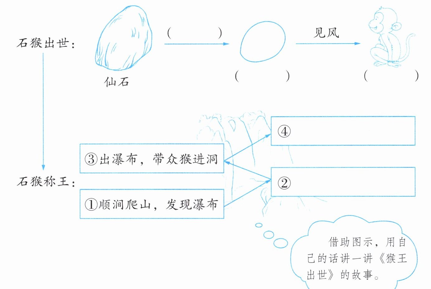 答案:迸裂;石卵;石猴;众猴约定谁进洞不伤身便拜为王;众猴拜石猴为王