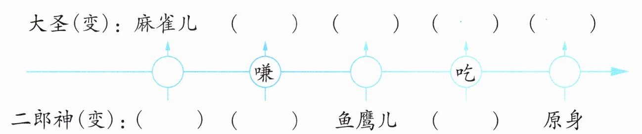 大圣慌了手脚,就把金箍棒捏做绣花针,藏在耳内,摇身一变,变作个麻雀儿,飞在树梢头钉住。二郎圆睁凤目观看,见大圣变了麻雀儿,钉在树上,就收了法象,撇了神锋,卸下弹弓,摇身一变,变作个饿鹰儿,抖开翅,飞将去扑打。大圣见了,搜的一翅飞起去,变作一只