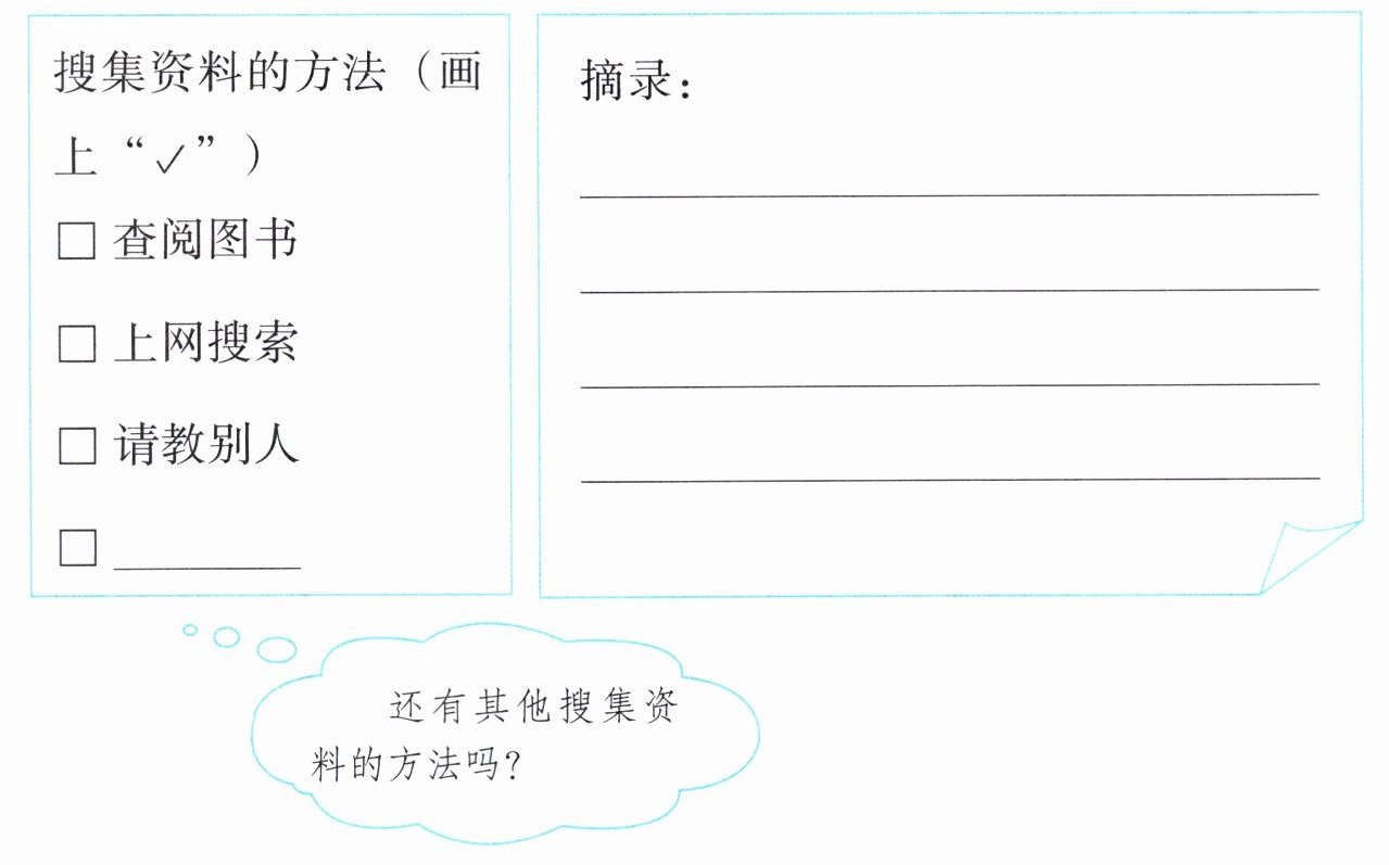 (3)搜集资料的方法:查阅图书(√);上网搜索(√);请教别人(√)