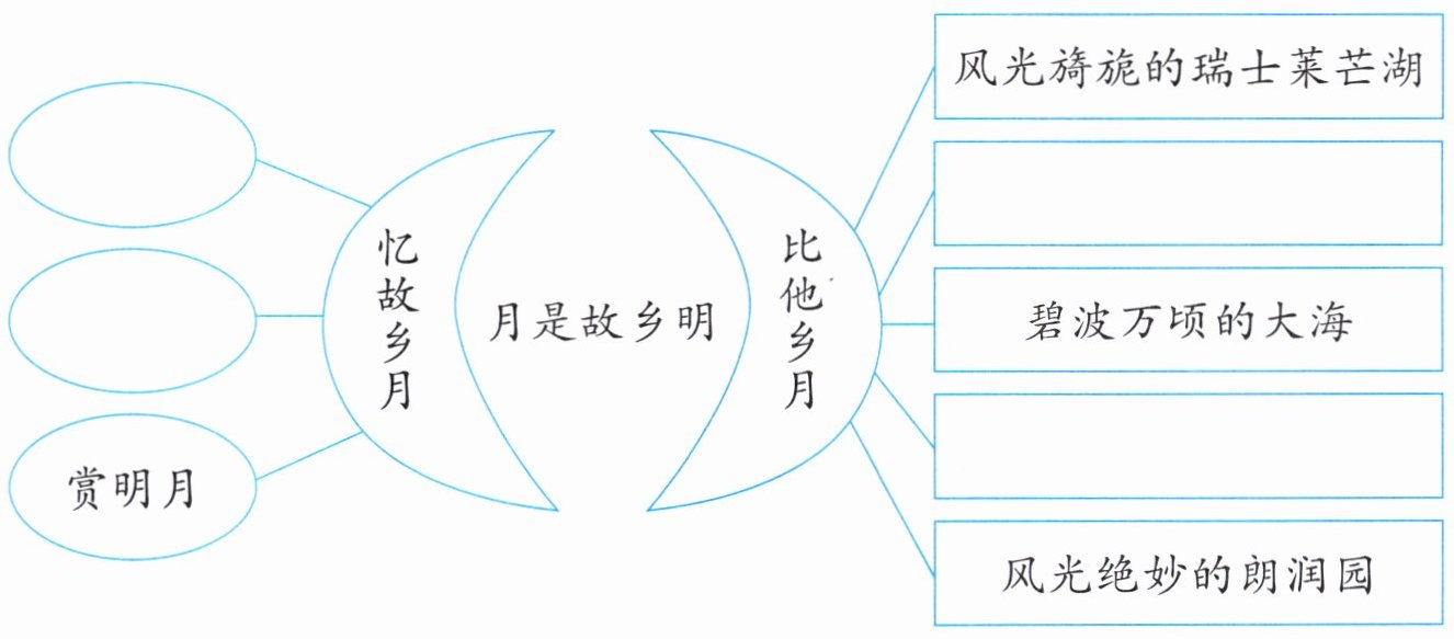 根据图中已给出的内容,本题填空数目为左侧“忆故乡月”下两个空白椭圆,应填入作者在故乡的与月相关的活动;右侧“比他乡月”下四个空白方框中的三个已给出,剩余一个应填入课文中提及的其他他乡之月所在地的景色。