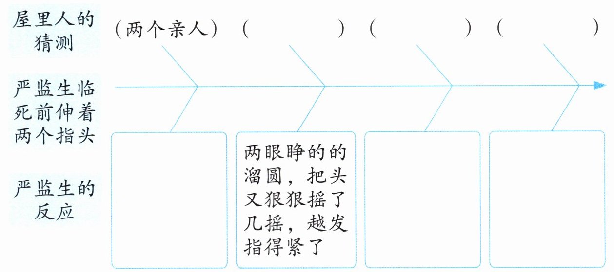 (1) 严监生临死前伸着两个指头,屋里人展开了哪些猜测?严监生又有怎样的反应?照样子填一填,并写一写你对此的看法。