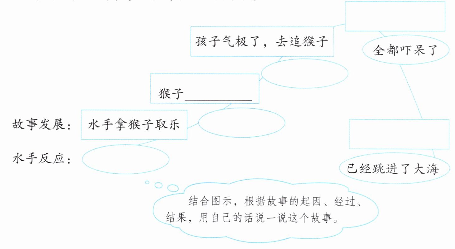 答案:故事起因:水手拿猴子取乐。经过:猴子抢走孩子的帽子并爬上桅杆,孩子气极了追猴子,爬上桅杆顶端,情况十分危险,水手们全都吓呆了。结果:船长命令孩子跳水,孩子跳进大海,水手们救起了孩子。