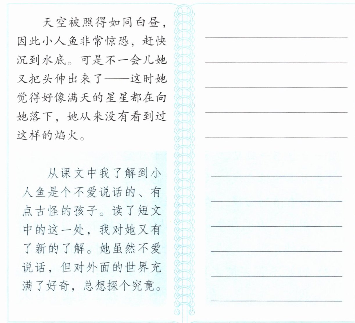 从课文中我了解到小人鱼是个不爱说话的、有点古怪的孩子。读了短文中的这一处,我对她又有了新的了解。她虽然不爱说话,但对外面的世界充满了好奇,总想探个究竟。