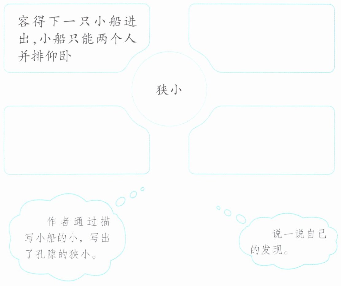 我的发现:作者通过描写小船的大小、乘船的方式、自己仰卧时的姿势以及在孔隙中的感受,从不同角度把孔隙的狭小写清楚了。