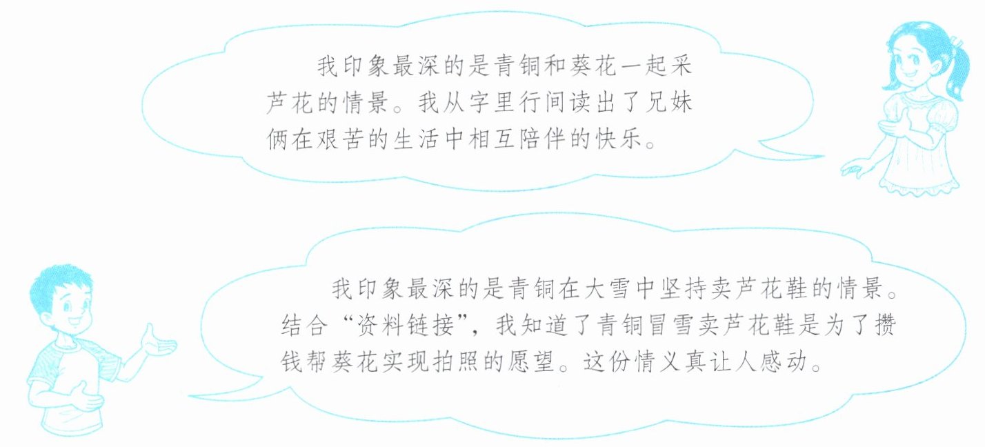 答案:我印象最深的是青铜在大雪中坚持卖芦花鞋的情景。结合“资料链接”,我知道青铜冒雪卖芦花鞋是为了攒钱帮葵花实现拍照的愿望。青铜和葵花虽然没有血缘关系,但他们互相关心、互相帮助,这份深厚的兄妹情谊让人感动。在艰苦的生活中,他们一家人不畏艰难、互相扶助的精神也值得我们学习。